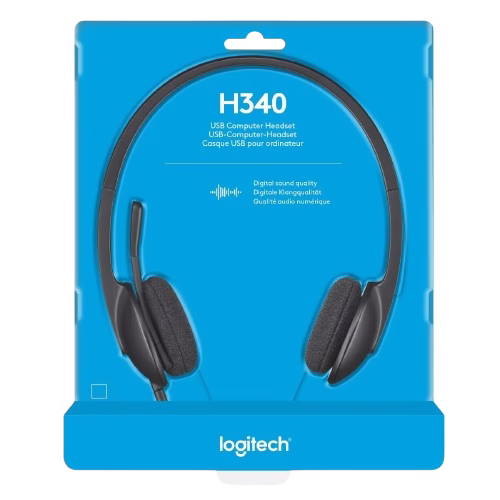 Logitech H340 USB Headphone with noise-reducing mic and USB plug-and-play, ideal for online meetings, calls, and office use.